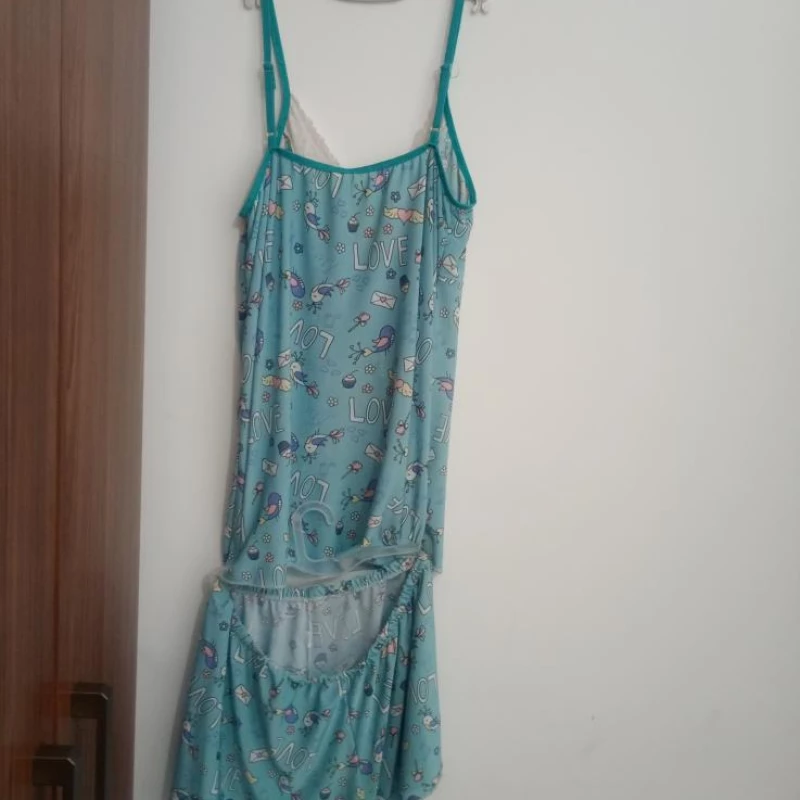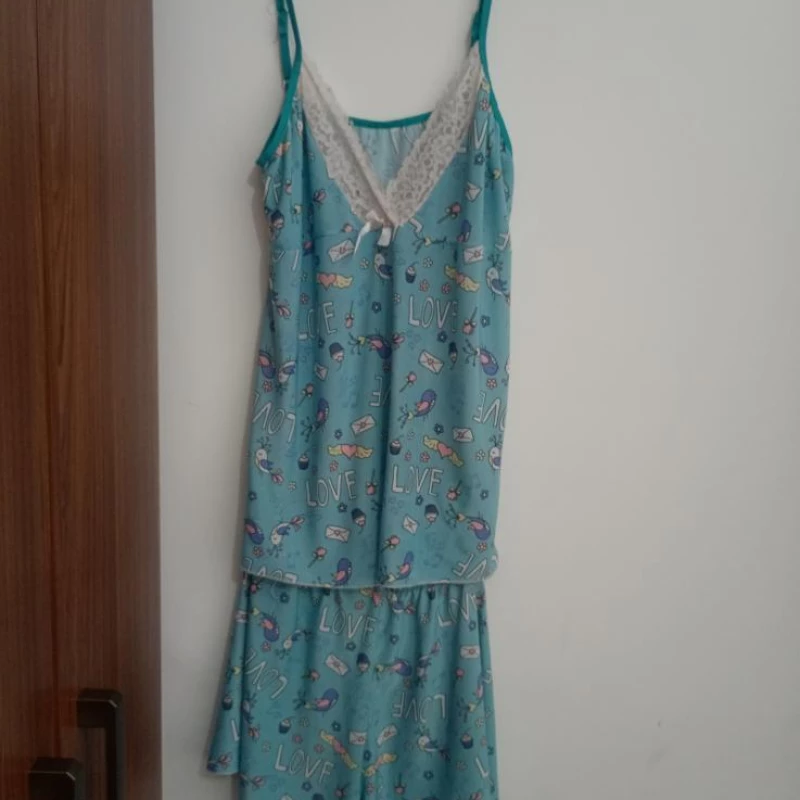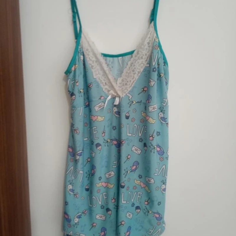 Modelo com shortinho fresquinho e blusinha de alcinha, perfeito para dormir com leveza e conforto nas noites mais quentes.